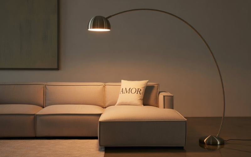 • A 1.6 m–tall arc lamp behind a sofa creates a vaulted reading nook.